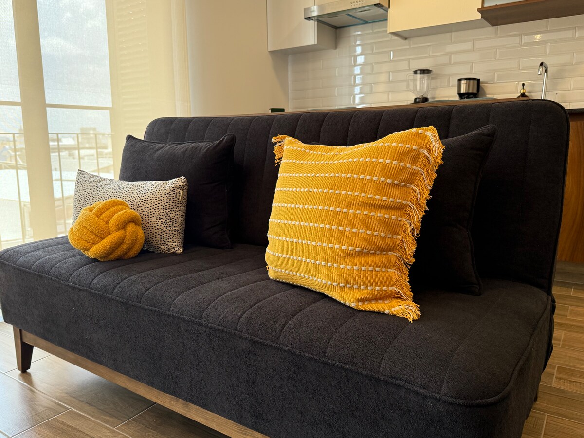 Expo Guadalajara in 2 minutes. Brand-new 3rd-floor loft with central A/C, 500 Mbps Wi-Fi, queen bed + sofa, equipped kitchenette, big TV, dining table and dedicated parking. Reception entry; smart lock at the door. Building perks: cowork + lounge with skyline views, gym, yoga terrace, grills, firepits and social rooms, billiard and fuzzball table. Near Chapalita and Mercado de Abastos. See the virtual tour, then book your dates or message me with questions. Go.