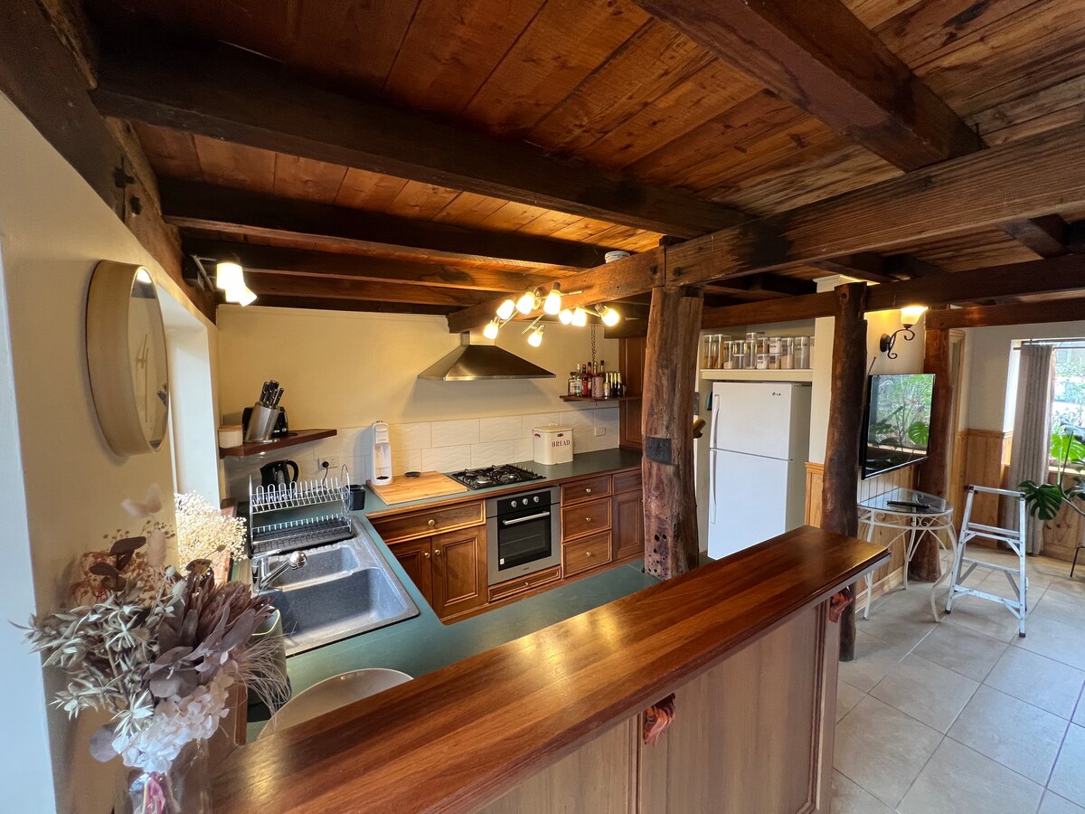Tenang dan bersantai di ½ Cottage unik kami….. Heritage Views. Pondok cantik kami telah direnovasi agar terasa rimbun, segar, bersih dengan langit - langit yang tinggi dan ruang yang luas untuk menendang dan bersantai. Kamar mandi dan shower yang menakjubkan menampilkan pemandangan langit dan bintang - bintang yang menakjubkan. Nikmati suasana seperti semak yang indah dan santai dengan secangkir teh di beranda. Manjakan diri dengan akhirnya menjadi horizontal di seprai bambu cantik kami….. Kami bersyukur Anda memutuskan untuk memanjakan diri di sini, dan kami harap Anda akan melakukannya!