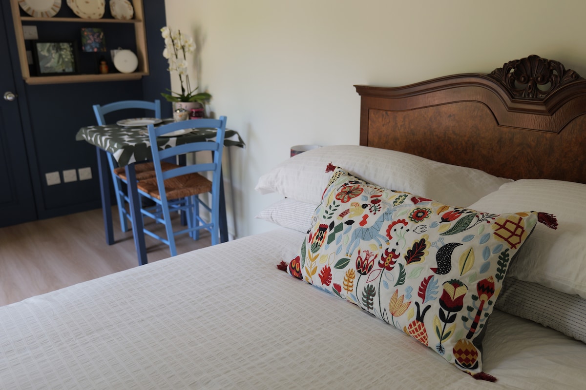 Properti ini adalah paviliun mandiri yang baru - baru ini dibangun di atas garasi yang terletak di South Downs. Tempat ini menawarkan ruang tamu terbuka yang luas cocok untuk 2 tamu. Area duduk kecil dengan sofa, kursi dan TV Digital (termasuk Amazon Prime), peti laci, ruang gantung, cermin panjang penuh, dll. Wi - Fi cepat. Dapur kecil dengan meja makan untuk makan/bekerja, microwave, ketel, pemanggang roti, dan kulkas. Teh, kopi, & gula gratis. Kamar mandi memiliki pancuran, wastafel & toilet, dengan cermin besar.