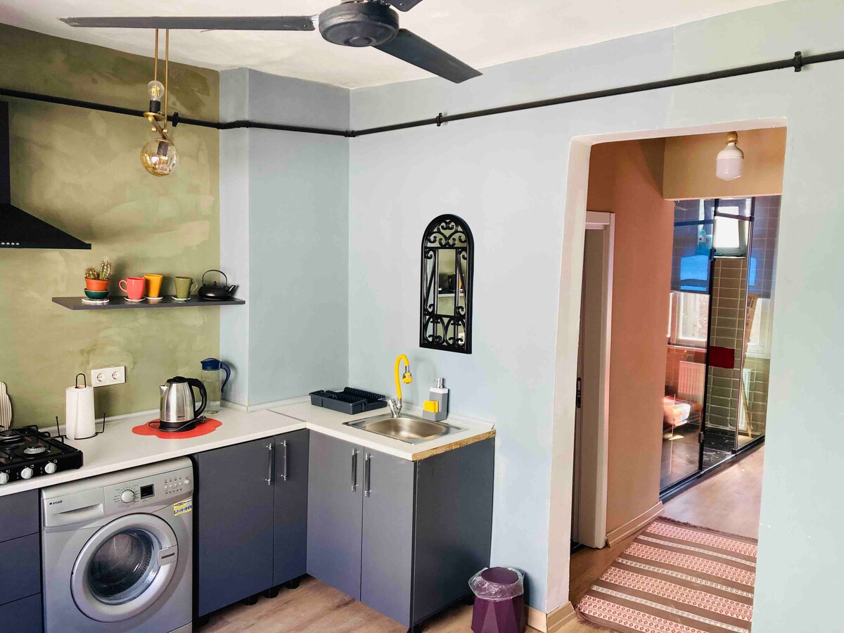 Flat 1+1 kami berada di lingkungan tinggal Beyoglu yang sangat tua dan sentral. Flat ini berada di gedung hunian yang aman dengan pengawasan 7/24h. Di pintu masuk flat, terdapat lemari pakaian berlapis. Dapur Amerika memiliki semua perlengkapan dasar: kulkas, oven, piring panas, dan juga kebutuhan dasar. Di ruang tamu Anda akan menemukan TV 4K di depan sofa - bed (di mana 1 orang bisa muat). Ada pula AC. Selain itu, kamar tidur kami memiliki tempat tidur berukuran King dengan kasur ortopedik.