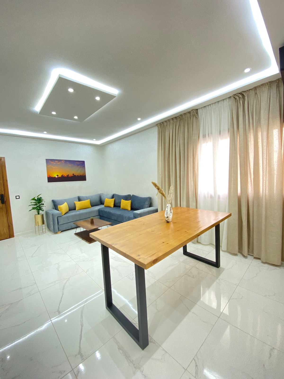 Découvrez nos appartements d'exception au cœur de Bhalil, un havre de paix à seulement 20 minutes de Fès. Avec deux chambres élégantes dotées de grands lits, vous profiterez d'un confort optimal. 2 salons : Le grand salon et le salon intime sont parfaits pour se détendre. La cuisine entièrement équipée attend vos talents culinaires. Ne manquez pas la terrasse, offrant une vue imprenable sur la ville. Un espace de sport et un grand restaurant privé complètent cette expérience unique