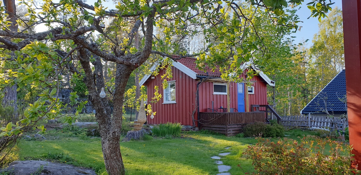 Koselig liten hytte i hage ved siden av utleiers bolig. Inneholder et lite soverom med en ganske høy dobbeltseng på 150cm adskilt fra oppholdsrommet med forheng. Hytta egner seg for 2 personer. Det er en 2seter sofa i oppholdsrommet, liten sittebenk ved spisebordet og bad. Hytta inneholder et minikjøkken med utstyr for matlaging. Veranda utenfor som hører til, med bord og to stoler. Det er ikke kjørevei fram til hytta, så bagasje må bæres fra p-plassen og opp, ca 50-60m.