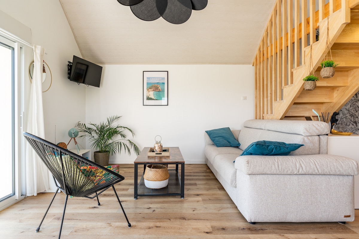 Habitat yang ramah iklim dan ekologi, rumah kayu kecil kami siap untuk menyambut Anda dan membawa Anda beristirahat dan bersenang - senang dengan mata. 35 meter persegi semua kayu hampir dibalut dan kayu berpanel dengan kayu thuya dan cypress dari penggergajian lokal, diisolasi dengan gumpalan kapas. Semuanya telah dipikirkan dan dirancang khusus untuk menciptakan kepompong kecil yang nyaman dan cerah. Pemandangan laut dari teras dan balkon mengundang Anda untuk menjelajahi teluk Audierne.