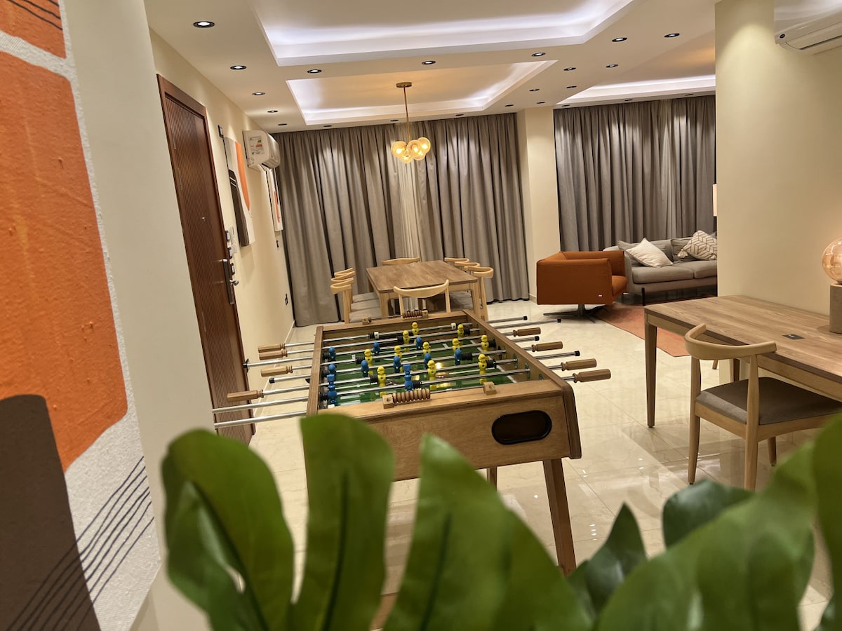 Welcome to our modern 3BR (200 sqm) hotel apartment by West Somid Developments! Designed for families, groups & professionals. Enjoy 5G Wi-Fi, 4 smart TVs, electric shutters & new furniture. 24/7 security, guest lobby, food delivery & optional cleaning. Guests can also enjoy a shared rooftop lounge — great for movie nights, relaxing evenings & family time. Just minutes from Mall of Arabia & top Zayed spots! ما نقدر نستضيف أي ثنائي عربي غير متزوج في نفس الشقة.