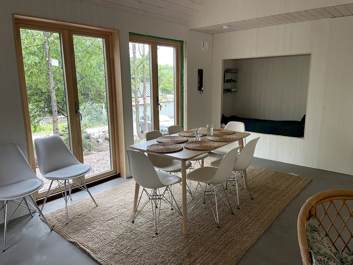 This separate cottage has a view over the sea in a secluded, beautiful countryside setting, still just 5 mins from the E6 motorway. It is recently completely refurbished keeping the old style. On first floor a living room with a cosy fire place (iron stove), a bathroom with toilet, shower and underfloor heating, a small but fully equipped kitchen, and a dining room with doors to the terrace. On second floor it is an open loft with limited height functioning as a bedroom with 4 beds in total.