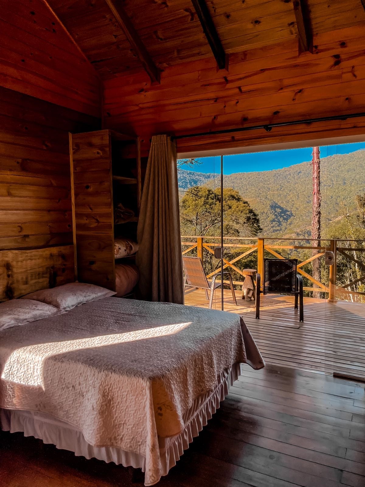 Nossas acomodações são aconchegantes, possuem Ar-condicionado, SmartTV com Netflix e WIFI ultrarrápido. Cada Cabana é equipada com cama box com colchão premium e sofá cama, além de uma cozinha completa com cooktop, geladeira e demais utensílios. Temos um quiosque com churrasqueira compartilhada junto com espetos e grelha. Disponibilizamos uma área externa com piscina, jardim e redário. Oferecemos uma deliciosa cesta de café da manhã entregue todos os dias no seu chalé 80,00 p/2 pessoas.