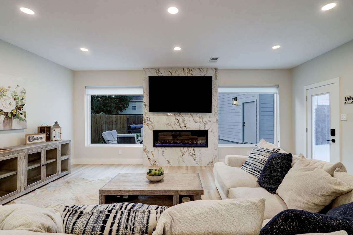 Rasakan perbedaan desain yang bisa dibuat di rumah khusus kami yang kami rancang dan bangun untuk tamu kami! 1800sf, 3bed, 2bath, cukup untuk 14 orang! Di pusat Chinatown, akses langsung ke Westpark Toll & Beltway 8. Ramah bayi/anak/hewan peliharaan! Semua perlengkapan dasar/fasilitas termasuk: dapur lengkap, 2 raja, TV di semua ruangan, perlengkapan tempat tidur/seprai premium, camilan/minuman gratis, semua perlengkapan mandi, ruang kerja khusus, mesin cuci pengering, port USB, wifi ultra cepat, dan Netflix, Hulu, Disney+, ESPN+!