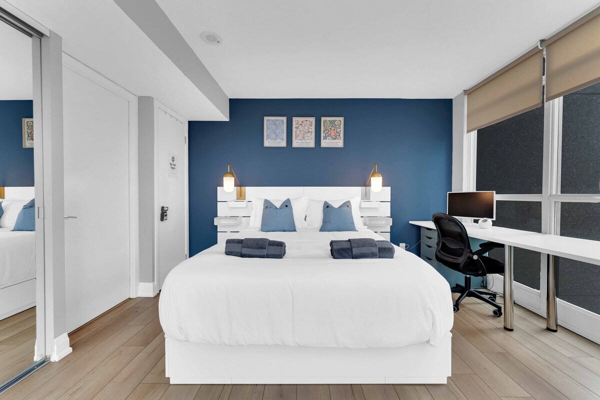 Selamat datang di Fort York Flat! Ruang 2 Kamar Tidur, 1 Kamar Mandi ini telah direnovasi dengan cermat menggunakan perpaduan dekorasi modern dan kontemporer untuk menciptakan tempat yang santai dan mewah untuk bersantai sambil menikmati semua yang ditawarkan Downtown Toronto. Lokasi dan smart lockbox kami terletak di pintu depan membuat check - in ke flat lebih mudah dari sebelumnya, tidak perlu khawatir tentang repot - repot dengan staf resepsionis atau menunggu lift.