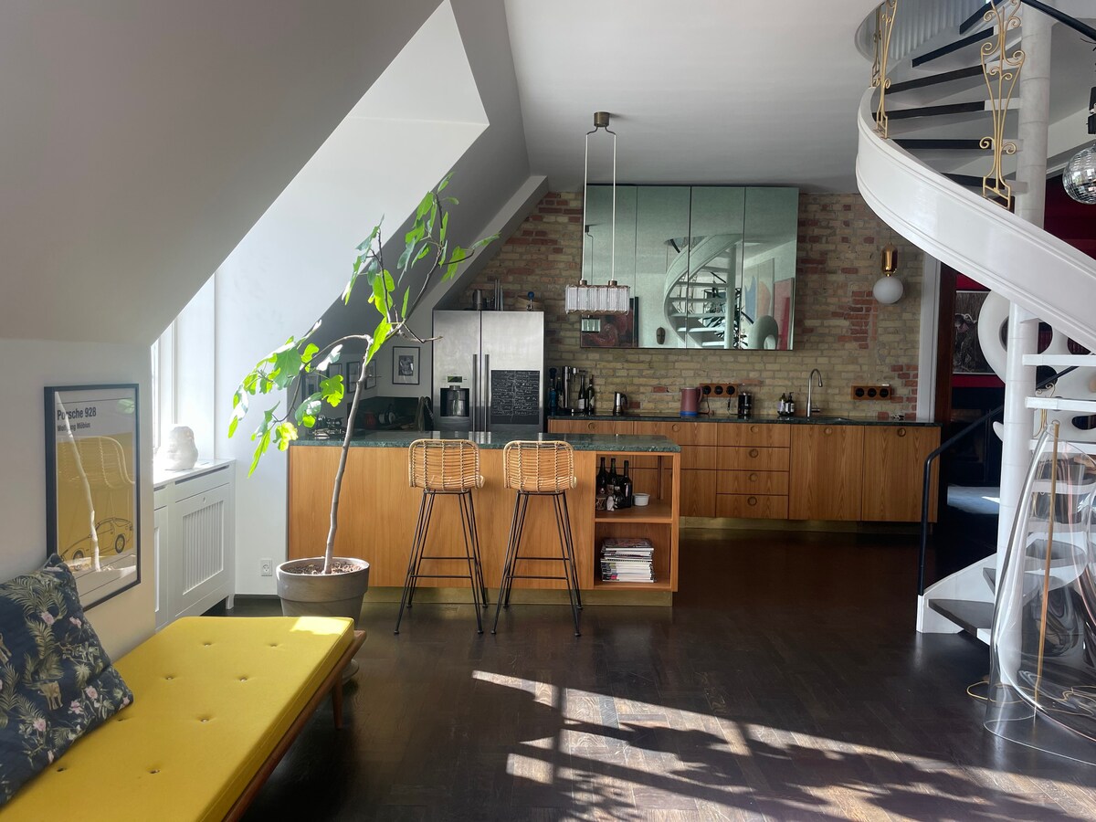 Tempat bersejarah di salah satu lingkungan tinggal terbaik dan sentral di Kopenhagen. 203 m2 di dua lantai dengan pemandangan spektakuler. 5 kamar. Untuk keluarga kecil yang menuntut atau pasangan yang ingin merasakan apa yang ditawarkan Kopenhagen dan menginap di tempat yang unik sekaligus..
