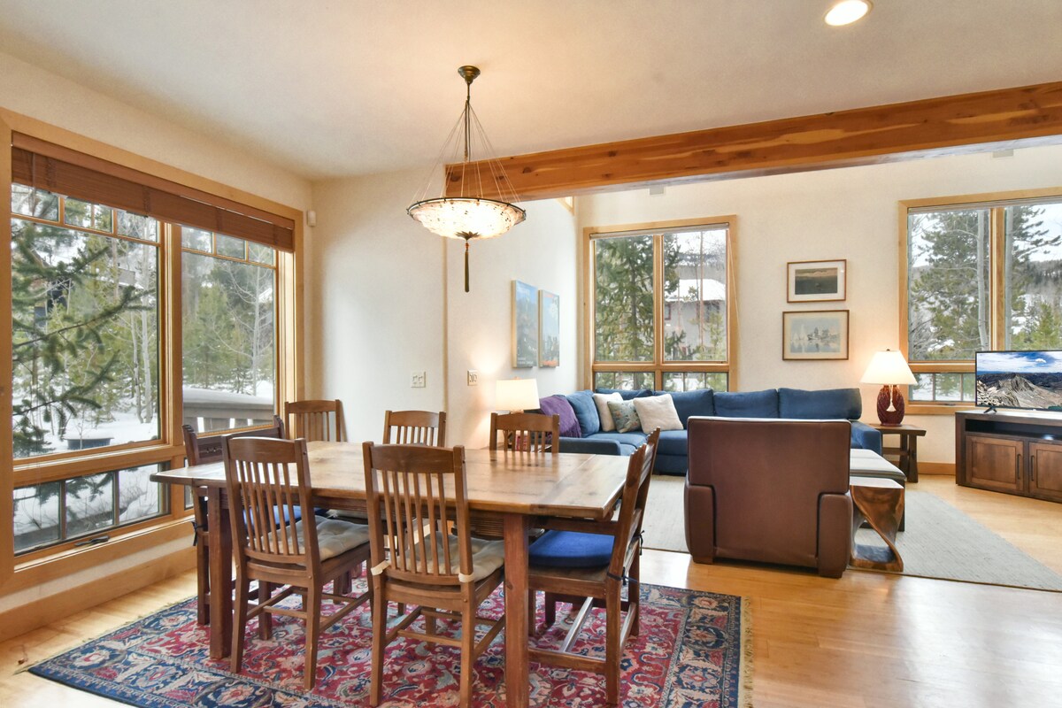 3BR 2 1/2BA ini memiliki tata letak terbuka yang memfasilitasi interaksi kelompok/keluarga. Dari area tamu, pintu kaca terbuka hingga dek dengan bak mandi air panas. Dari dek dan area tamu, pemandangan pegunungan berlaku di musim dingin dan aspens yang menjulang tinggi memberikan keteduhan di musim panas. Suite utama terletak beberapa langkah di atas area tamu dan dua kamar tidur terletak tepat di bawah lantai masuk. Dek belakang yang mendukung bak mandi air panas berada di lantai utama tepat di luar area tamu utama.