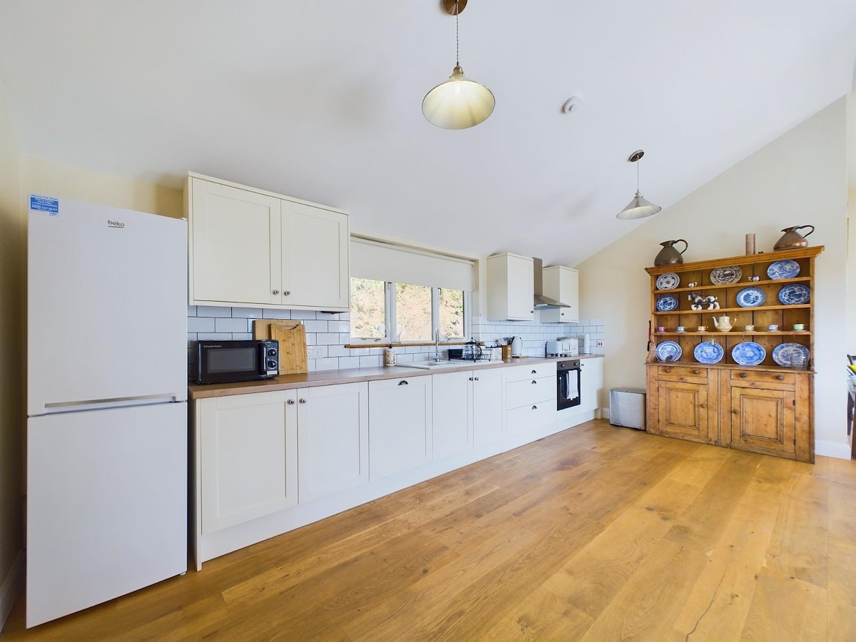 Ruang duduk lantai dasar, area makan dapur, kompor kayu untuk bersantai di dekat perapian, hanya digunakan di Musim Dingin. Dapur - lemari yang dipesan lebih dahulu, meja kerja granit dengan AGA listrik. Ruang tamu/ruang makan bergaya terbuka yang dipesan lebih dahulu. Tangga Oak menuju lantai satu landing, kamar tidur utama dengan tempat tidur berukuran king, sandaran tempat tidur berlapis beludru, jendela bulat besar memiliki pemandangan yang luar biasa, kemewahan sejati. Kamar mandi kontemporer terpisah, dengan pancuran di atas bak mandi, wastafel, wc, dan pagar handuk berpemanas.