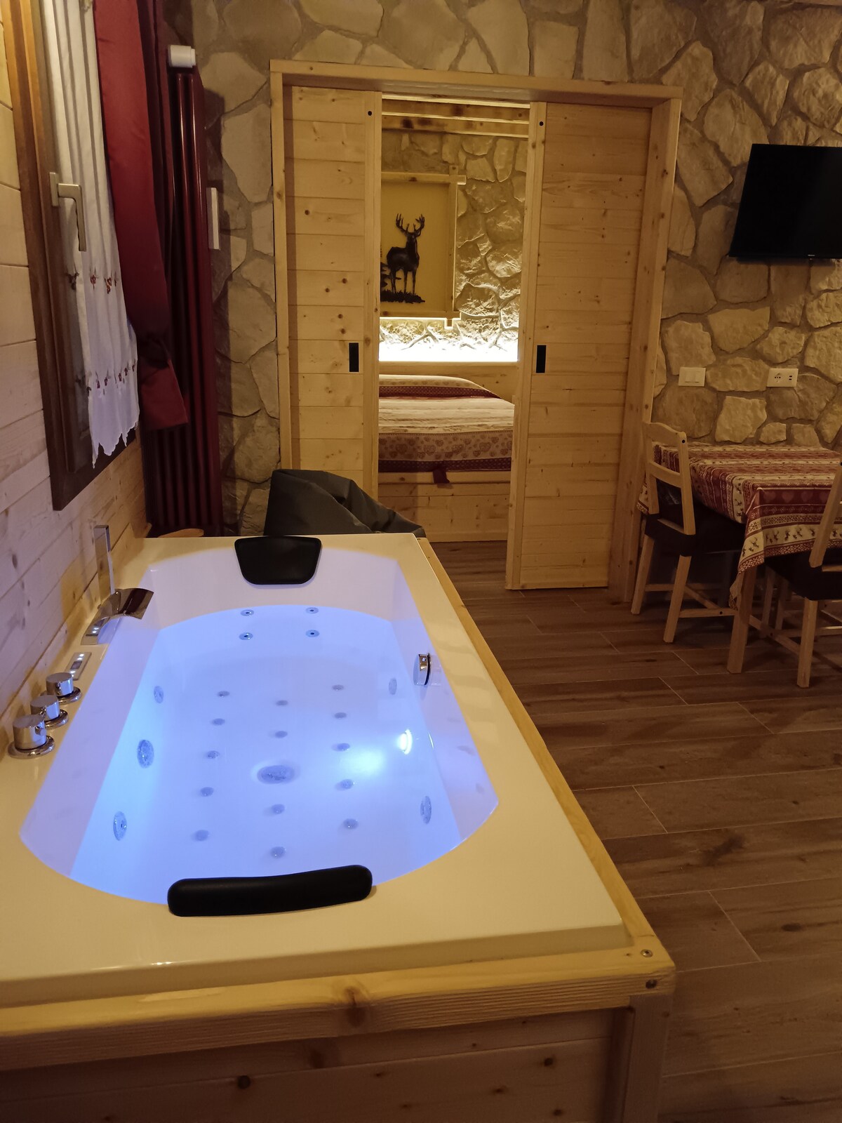 Appartamento romantico in stile chalet,40mq, con vasca idromassaggio e sauna con cromoterapia ad uso esclusivo,camera matrimoniale,divano ,Alexa Echo,angolo cottura completo(bollitore,stoviglie,frigo,piano induzione,grill,lavastoviglie), tv, bagno, biancheria, asciugamani, wifi, terrazzino con tavolino, sgabellini,cassettone con prodotti pulizia.Camino ad ultrasuoni. E' vietato fumare e ricevere ospiti. Per sicurezza i minori di 13 anni non possono soggiornare. Animali non ammessi.