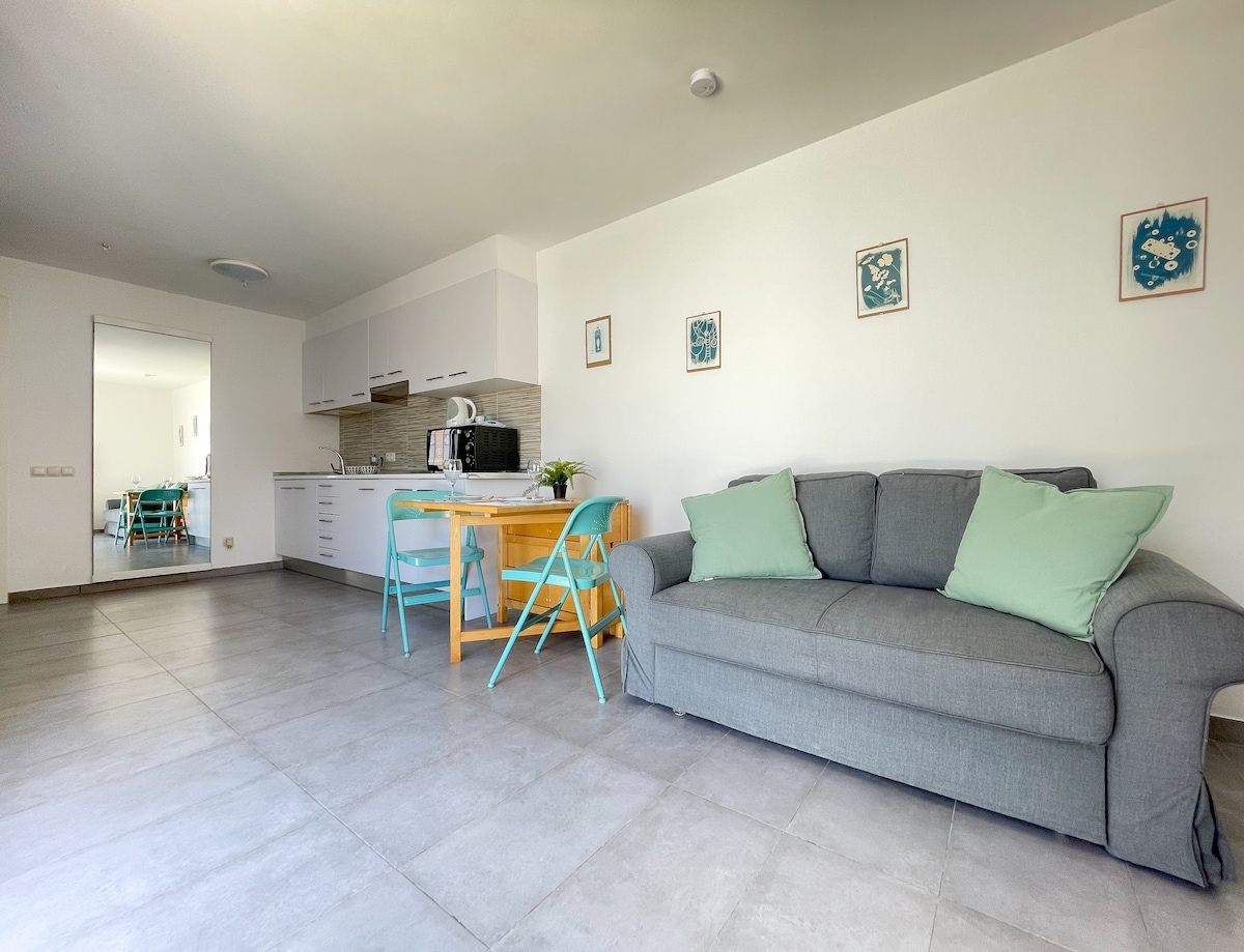 Apartemen yang bagus & nyaman direnovasi dengan gaya. Dari ruang tamunya menghadap kolam renang, menampilkan teras cerah yang memiliki kursi santai dan ruang makan luar ruangan di bawah payung. Kompleks yang tenang namun sangat sentral, dengan bar dan restoran di alun - alun pusatnya yang buka sepanjang tahun.