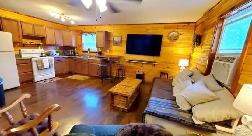 Kabin kayu berperabot lengkap akan tidur 5 hingga 6 orang dewasa dengan nyaman dengan satu tempat tidur queen dan tiga tempat tidur twin. Fasilitas tambahan meliputi: kulkas lengkap, kompor baru, microwave, teko kopi, mesin cuci/pengering, dan TV kecil. Ada kamar mandi lengkap di lantai bawah dengan pancuran dan bak mandi. Kabin ini berada di peternakan aktif yang dikelilingi hutan dan padang rumput dengan lahan makanan dan kolam satwa liar. Ini adalah tempat yang bagus untuk kendaraan roda 4. Kami sangat dekat dengan 2 sungai yang sangat cocok untuk berkayak.
