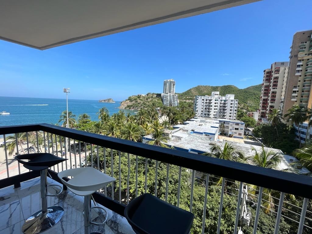 Comodo apartasuite con vista al mar, Edf. con: jacuzzi. piscina en terraza. sauna. turco. dispondrás de cocina completa y equipada. aire acondicionado. ventilador de techo. 2 Smart tv. reproductor de sonido. 2 camas dobles con colchones resortados, 1 amplio sofacama de más de 1.90 Mt de largo. ubicación estratégica, será muy fácil planear tu visita, en rango de 1 a 3 cuadras. cuentas con más de 4 supermercados droguerías. restaurantes. el mar. acuario. un centro comercial. agencias de turismo.