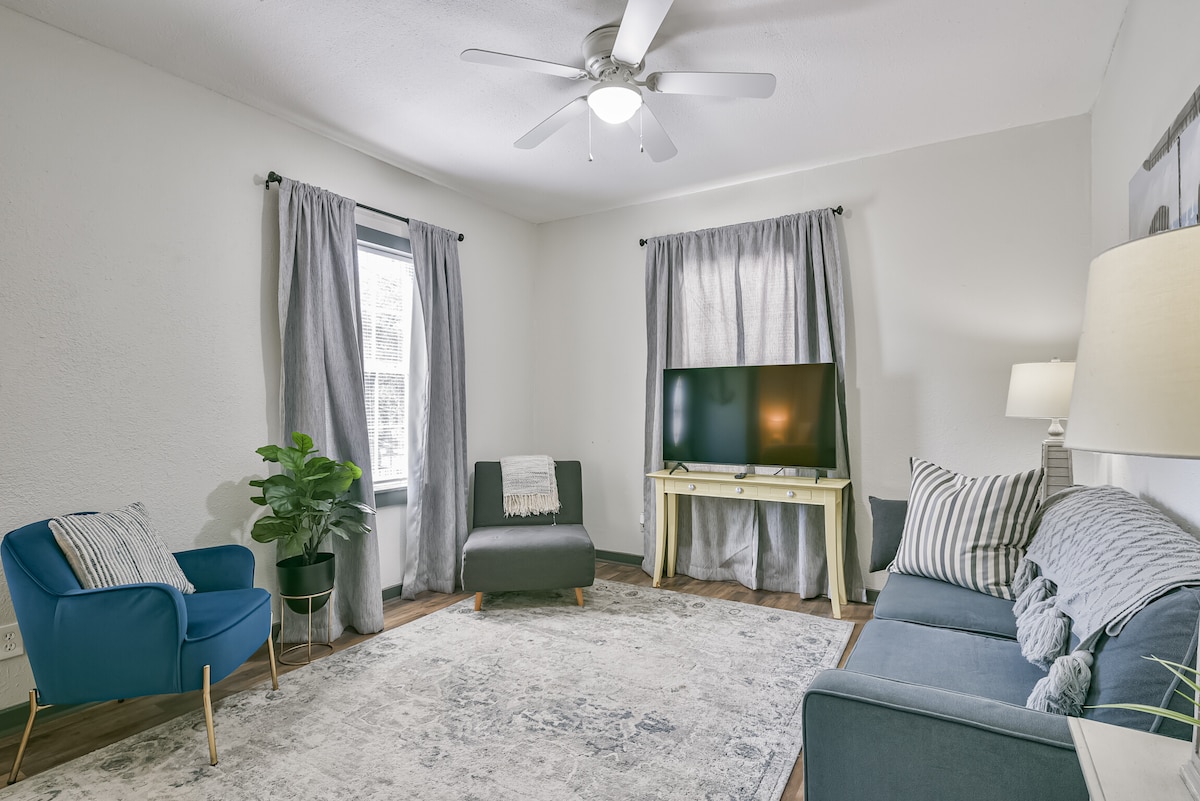 Liburan sempurna dengan semua fasilitas rumah! Rumah kecil halaman belakang ini adalah tempat yang sempurna untuk 2 orang. Tempat tidur queen, dapur kecil dengan Kopi, microwave, dan kulkas mini. Kami juga menyediakan piring untuk takeout Anda. Smart TV. WiFi juga menjadikan tempat ini sempurna untuk menjaga jarak sosial dan bekerja berlibur jika diperlukan. Meja di sofa untuk makan atau bekerja. Meskipun halaman belakang digunakan bersama dengan tamu dari rumah depan sangat rimbun dan memiliki beberapa ruang duduk untuk privasi Anda sendiri.
