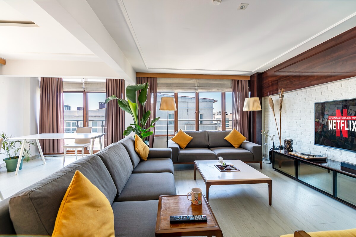 Terletak di tepi laut Cihangir/Beyoglu (area modern di Istanbul yang penuh dengan kafe, bar, dan galeri) flat deluxe seluas 160 m2 ini berjarak 2 menit berjalan kaki ke tepi pantai & trem, 15 menit berjalan kaki ke pusat kota & kereta bawah tanah Taksim. Dirancang dengan perabotan bergaya japandi, apartemen yang cerah ini memiliki pemandangan bosphorus yang indah di semua kamar dan area. Tempat ini mengakomodasi hingga 6 orang. Dari mesin espresso hingga dispenser air dingin, peralatan yoga, atau Netflix gratis... Semua kebutuhan Anda untuk liburan impian tersedia.