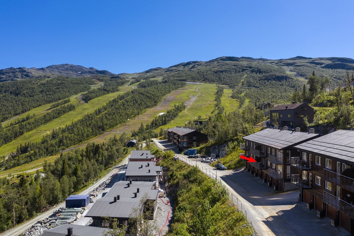 Hytta ligger i et nytt hytteområde med langrennsløypene 100 meter fra. Alpinanlegget med skistua er 5 minutters kjøretur unna. Hytta har grunnflate på 70 kvm og høy hems med 2 soverom og et lekerom. Fin uteplass på 40 kvm platting. Det er 6 km til Norefjell golfklubb og 6km til Norefjell ski og spa og deres fasiliteter. Nærmeste matbutikk er Joker som er 1 km unna. Den er åpen hele døgnet.