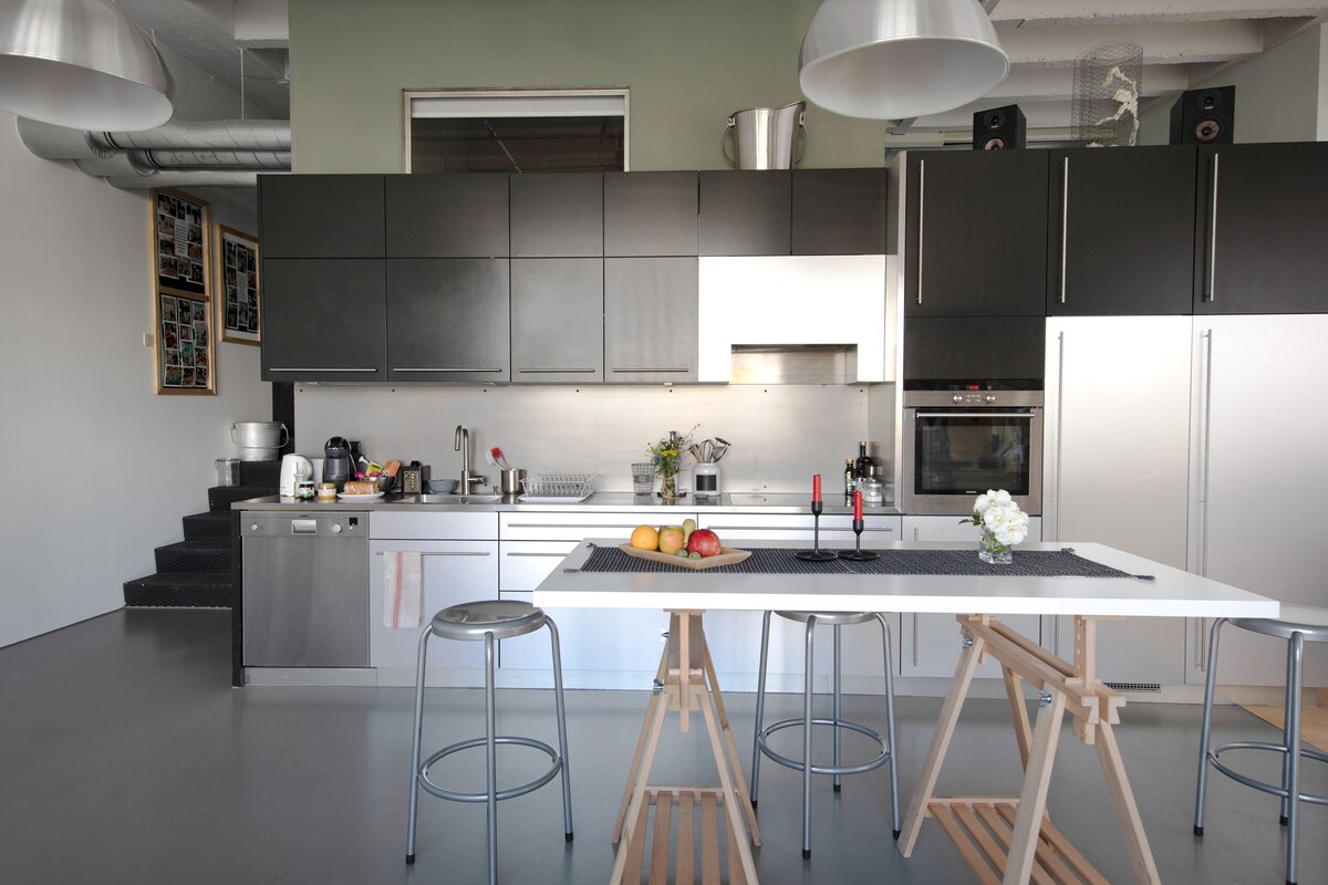 Apartemen dupleks loteng mewah seluas 150m². Lantai dasar: kamar tidur dengan tempat tidur queen size dan bak mandi cekung di dalamnya; toilet terpisah; dapur terbuka; ruang tamu; langit - langit tinggi; pemanas lantai; taman kerikil kecil. Lantai bawah: kamar dengan tempat tidur twin; toilet/pancuran; pemanas portabel. Lantai kayu yang indah di seluruh ruangan (kecuali kamar tidur dengan karpet sisal dan kamar mandi di lantai bawah dengan ubin keramik). Pintu masuk pribadi. Tenang. Terletak di pusat kota.