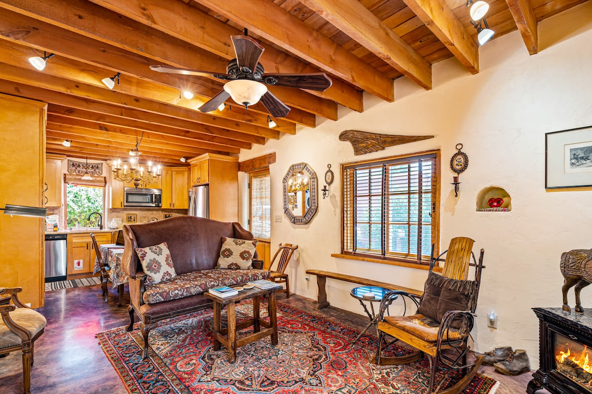 Casita adobe klasik bersejarah kami yang menawan berjarak sepuluh menit berjalan kaki dari Santa Fe Plaza, bersantap, dan museum. Kami menawarkan parkir pribadi di jalan untuk dua kendaraan. Interiornya menampilkan balok kayu bergaya Santa Fe klasik di langit - langit Viga, perapian kiva yang dilengkapi dengan kayu, skylight, area tamu dapur lengkap, kamar tidur pribadi, bak berendam, peralatan modern, mesin cuci & pengering, pendingin rawa, WIFI, TV layar datar, halaman tertutup yang indah dengan pohon - pohon dewasa dan BBQ. Anjing dipersilakan.