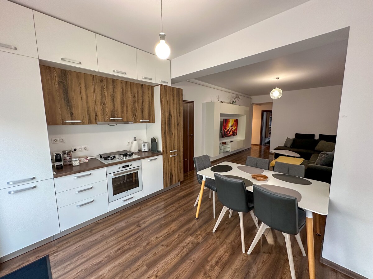 This charming two double bedroom Airbnb apartment near Brașov combines comfort and modern convenience. It features a spacious living area with cozy furnishings and stylish decor. The fully equipped kitchen boasts sleek appliances, perfect for preparing meals. The apartment also includes two bathrooms, with washer and dryer equipment. With a serene atmosphere and easy access to Brașov's attractions, this is an ideal retreat for families or small groups seeking both relaxation and fun.