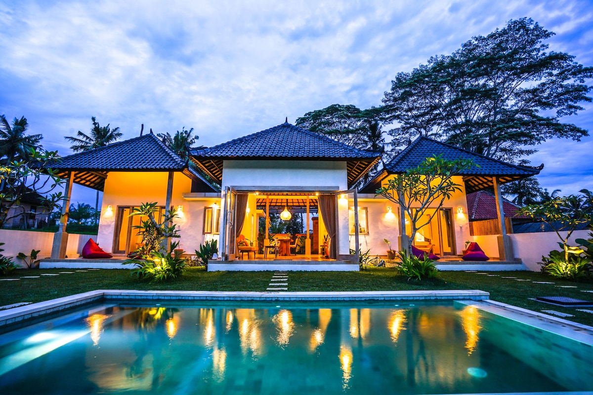 Villa 2 BR dengan pemandangan terbuka sawah & sunset