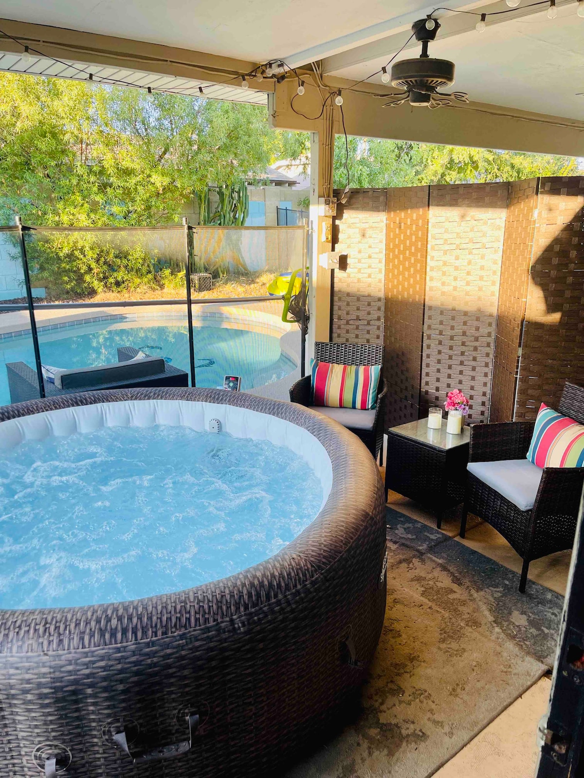 Selamat datang di Rumah Buatan Tangan di gurun pasir. Ada area luar ruangan besar dengan kolam renang berpemanas, bbq, dan meja pemadam kebakaran propana. Pemanasan kolam renang termasuk dalam biaya menginap Anda mulai Oktober - Mei. Anda akan menikmati hiburan di dapur koki lengkap dengan peralatan yang diperbarui dan air fryer di oven. Tempat tidur yang nyaman adalah busa memori dan kamar mandinya diperbarui. Lewati hari pertandingan/lalu lintas konser dan pilihlah berjalan kaki dengan mudah. Kami terletak 0,8 mil dari State Farm Stadium.