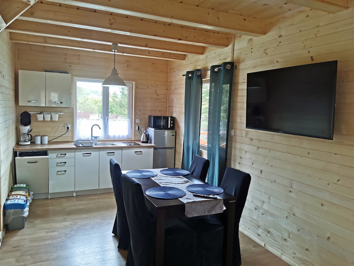 Pondok kayu sepanjang tahun dengan bak mandi air panas listrik pribadi, perapian, dan teras yang terletak di antara pepohonan, terletak di hutan. Tempat ini memiliki kamar tidur, ruang tamu dengan dapur (kulkas, ketel, microwave, kompor, wastafel, peralatan dapur, meja dan kursi), dan kamar mandi. Pemanas lantai, Wi-Fi, dan AC. Teras menghadap hutan dan kolam liar, menghadap ke barat daya. Jalur bersepeda Green Velo berjarak 300 meter. Tempat menarik di sekitar termasuk kayak dan cagar alam.