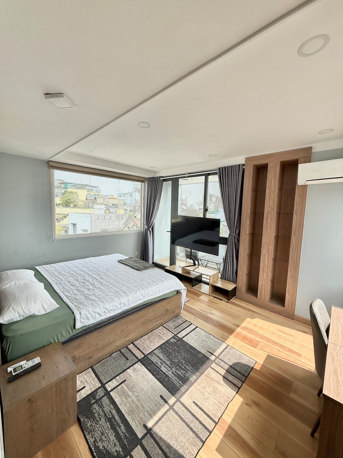 Apartemen dengan pemandangan jalan yang sibuk di siang hari dan damai di malam hari, berjarak 2 km dari bandara, 9 menit dari bandara, tepat di samping taman pusat hijau. Di malam hari Anda bisa pergi ke taman untuk berjalan - jalan dan menikmati makanan jalanan Vietnam. Pada hari - hari yang berbatasan dengan Tet, pasar bunga yang diadakan di sini membuat suasana ramai dan berwarna - warni. Interiornya memiliki kursi berjemur, area luar ruangan yang sejuk dengan keamanan 24/7 di seluruh properti. Aman, damai, dan segar.