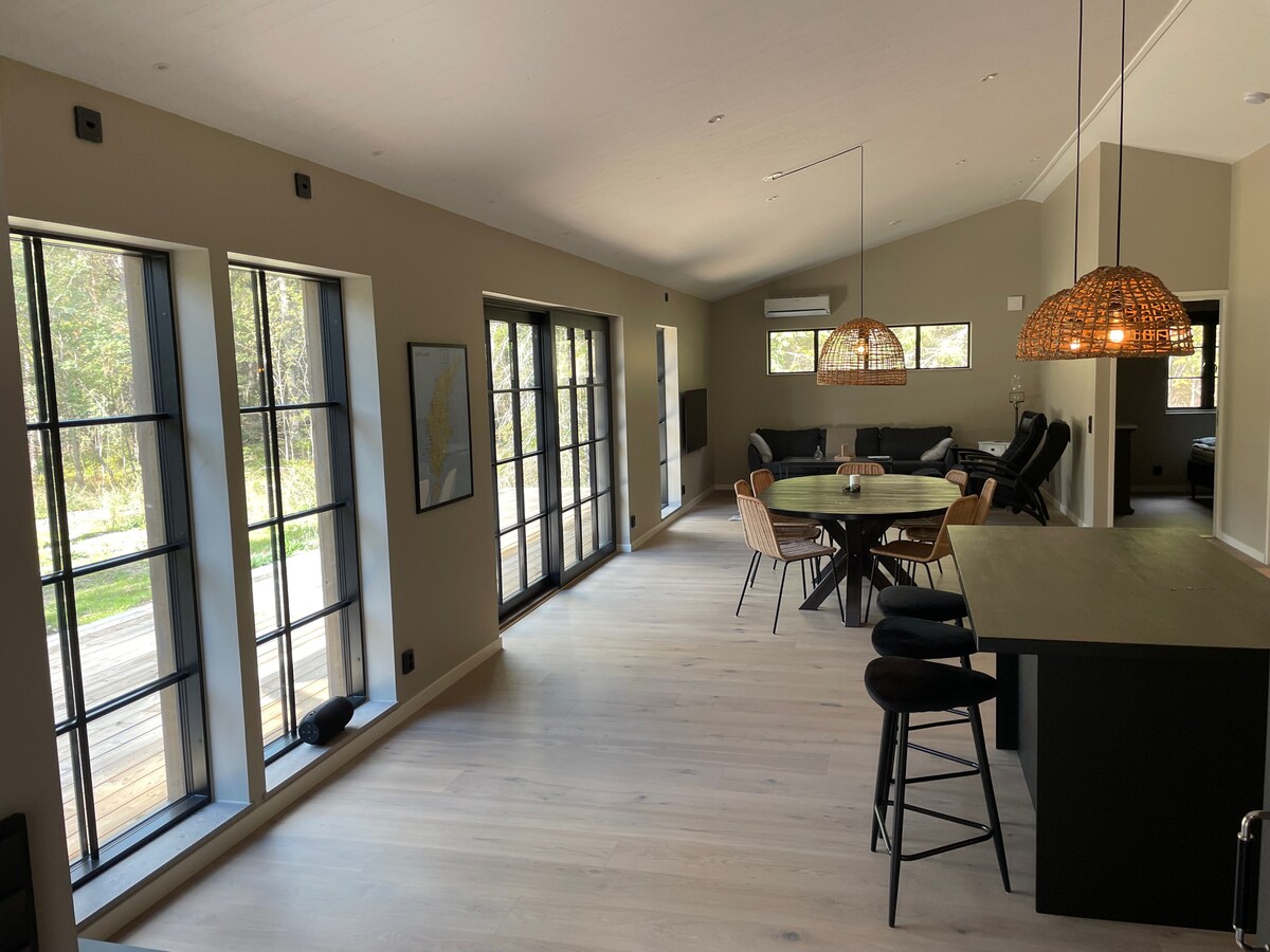 Properti unik & mewah! Vila ini, dibangun pada tahun 2022, terletak di lokasi pribadi dengan pemandangan padang rumput dan kawasan hutan yang tidak terhalang dan memiliki semua fasilitas yang bisa diharapkan. Selama bulan - bulan musim panas, cuaca cerah dari pagi hingga malam hari. Pada jarak berjalan kaki dan bersepeda ada Tofta Strand serta Gnisvärds Fiskeläge dengan beberapa restoran, toko roti oven batu, lapangan golf mini, penyewaan layang - layang, papan selancar, lapangan padel, lapangan tenis, gym luar ruangan, toko kelontong, dll. Akomodasi kami juga mencakup e - bike dengan area kargo. Selamat datang!