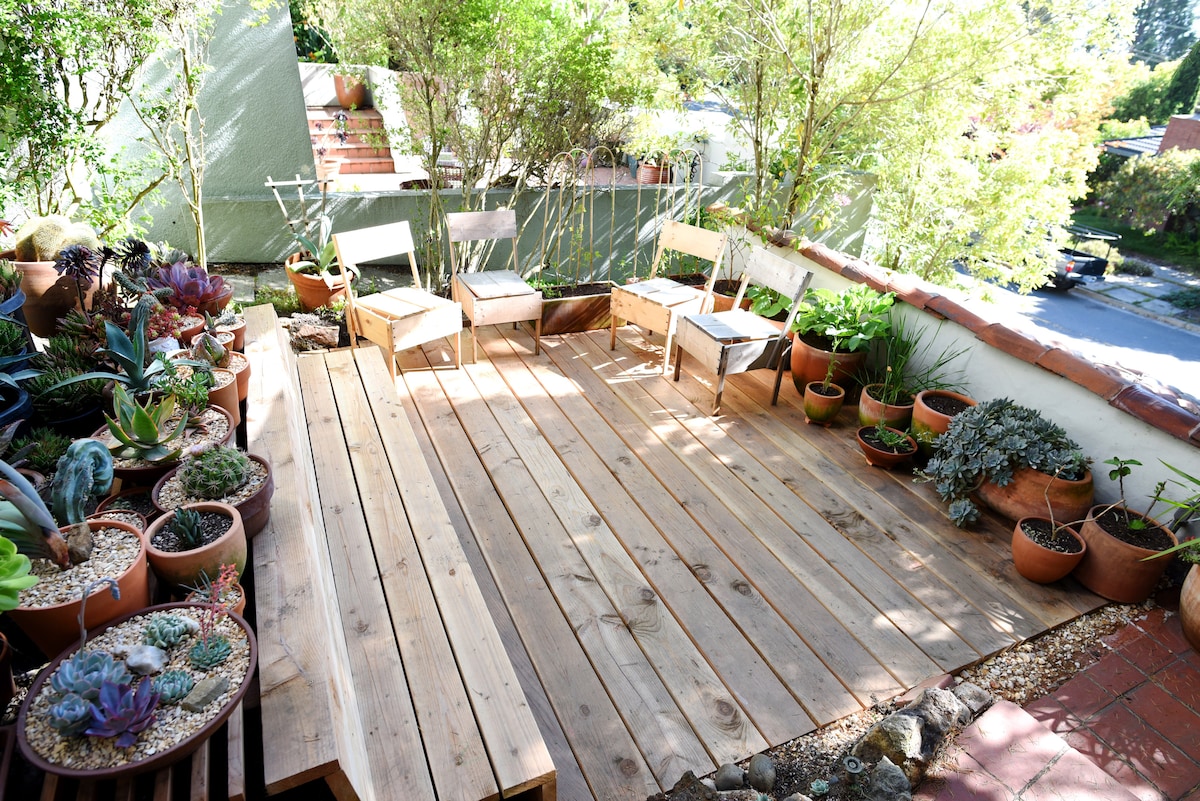 Located halfway up the steep Berkeley hillside in a quiet residential area. The space has amazing natural light with 4 skylights and garden facing windows. There is a patio deck with table and chairs to enjoy meals outdoors. Previously an art studio, now a simple detached cottage at the entrance of our property. Please make sure to read through the description and ask us any questions prior to booking.