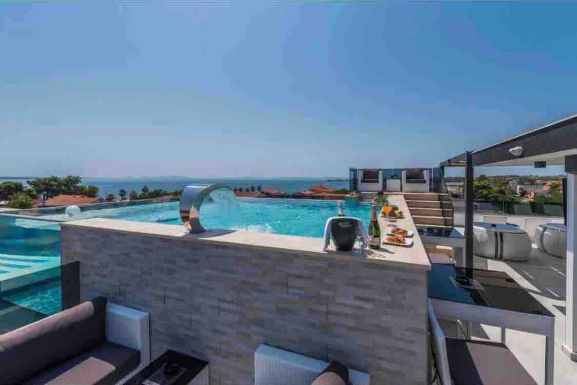 Nikmati dekorasi bergaya rumah ini di tengah - tengah pulau Vir. Rasakan liburan atap mewah sejati di kolam renang di bagian atas bangunan dengan kaca!