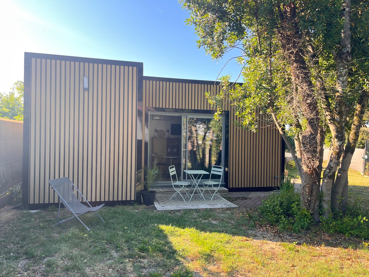 Pondok menawan dengan teras pribadi dan pintu masuk individu. Ideal untuk 1 -4 orang, nyaman dan bergaya menawarkan mezzanine dengan tempat tidur double dan tempat tidur sofa yang nyaman. Hanya 5 km dari bandara Mérignac (transfer mungkin), sangat ideal untuk menjelajahi Bordeaux (15 menit dengan trem), kebun anggur dan pantai lautnya yang terkenal. Halte bus - 2 menit, trem - 15 menit berjalan kaki. Nikmati sarapan ringan yang ditawarkan, suasana tenang dan hijau, dan parkir gratis di jalan.