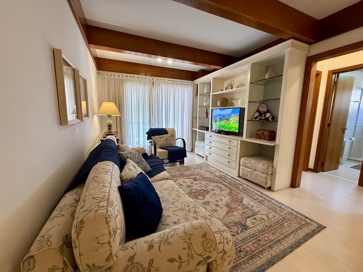 📍Terletak di tengah Gramado; dekat dengan restoran, pasar, dan tempat wisata utama kota; ✅ Ruang yang aman dan tenang; 🛏️ Muat hingga 4 orang; 🛏️ 2 kamar tidur dengan: 1 tempat tidur berukuran king dan 2 tempat tidur single; 🚗 1 tempat parkir tertutup; ❄️/☀️ 2 AC (panas/dingin) di kamar tidur; 📶 Wi-Fi cepat; 🍽️ Dapur lengkap; 🔥Pemanggang barbeku; 🛌 Kami menyediakan seprai dan handuk berkualitas tinggi; 🐶 Hewan peliharaan tidak diizinkan.