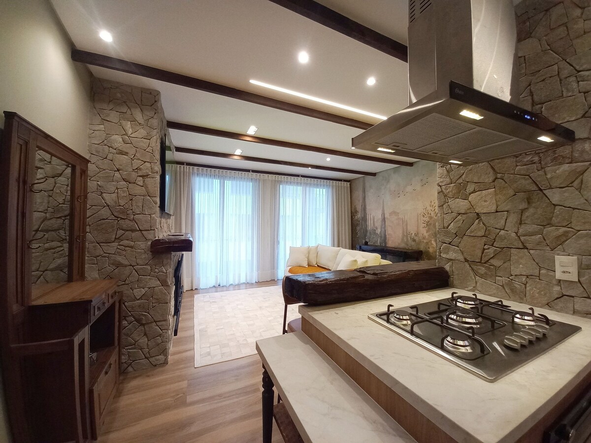 Apartamento muito bem decorado, com lareira, calefação, aquecimento à gás e adega e fica localizado em meio a uma vasta área de mata nativa. A pouco mais de 1Km do centro é possível acessar a "Praça das Etnias", Rodoviária e Rua Coberta com uma caminhada de até 20min. A localização e a estrutura do apartamento e do condomínio permitem tranquilidade e descanso, ao mesmo tempo em que está há apenas a 5min (de carro) da região de bares, cafés, restaurantes e lojas da cidade.