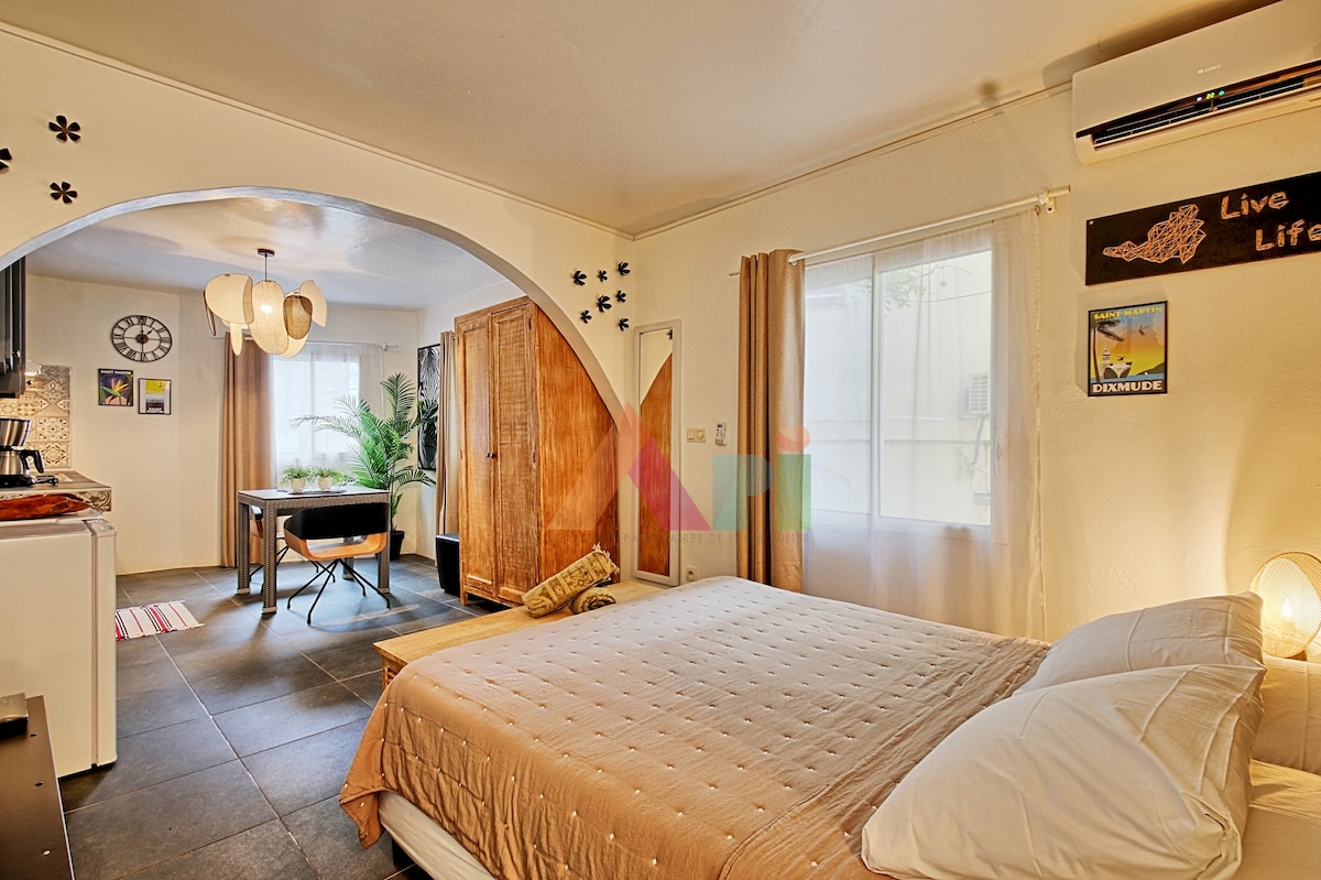 Rumah kecil yang menawan dan nyaman dengan taman pribadi dan hutan, berlokasi ideal di sudut paling tenang dan paling aman di Grand Case: Pantai kecil. Berjalan kaki 300 meter dari pusat budaya Saint Martin, Boulevard de Grand Case dengan banyak restoran ini, akomodasi ini berada tepat di depan pantai dan batu Creole yang bisa Anda jelajahi dengan kayak kami. Halaman interiornya yang kecil akan memungkinkan Anda untuk bersantai sepenuhnya dengan tenang di sekitar BBQ terbuka.