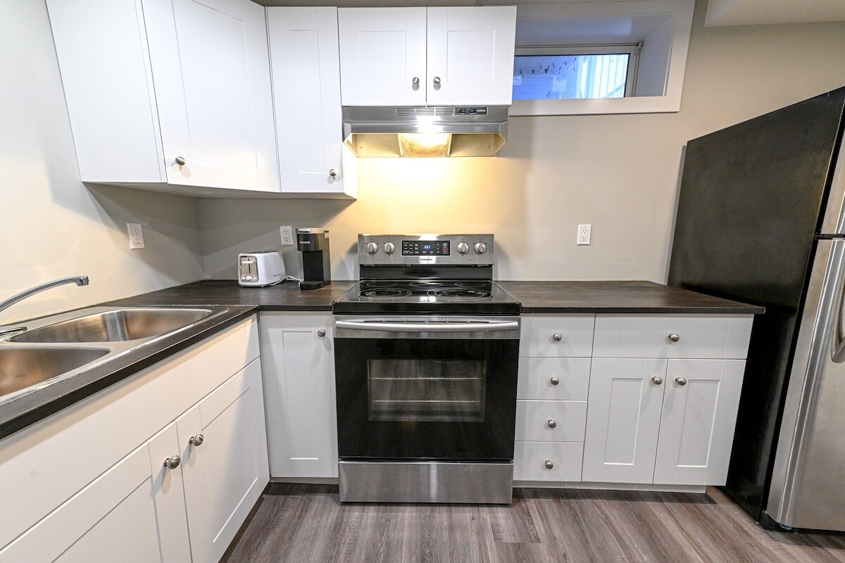 Kalahkan panas di ruang bawah tanah pribadi yang didekorasi dengan selera tinggi ini. Dua kamar tidur dengan kasur nyaman, selimut & bantal. Dapur lengkap dengan segala kebutuhan Anda untuk memasak & menyantap makanan. Ruang tamu dengan perapian/pemanas & TV 55". Kamar mandi dengan shower besar. Penatu bersama di level Anda. Wi - Fi berkecepatan tinggi tanpa batas, saluran Olahraga, Netflix, penyewaan film Disney +, & Pac - Man. Patio dengan meja makan dan kursi, BBQ & halaman belakang. Lingkungan tinggal yang tenang dekat dengan jalur berjalan kaki. Taman jalanan gratis