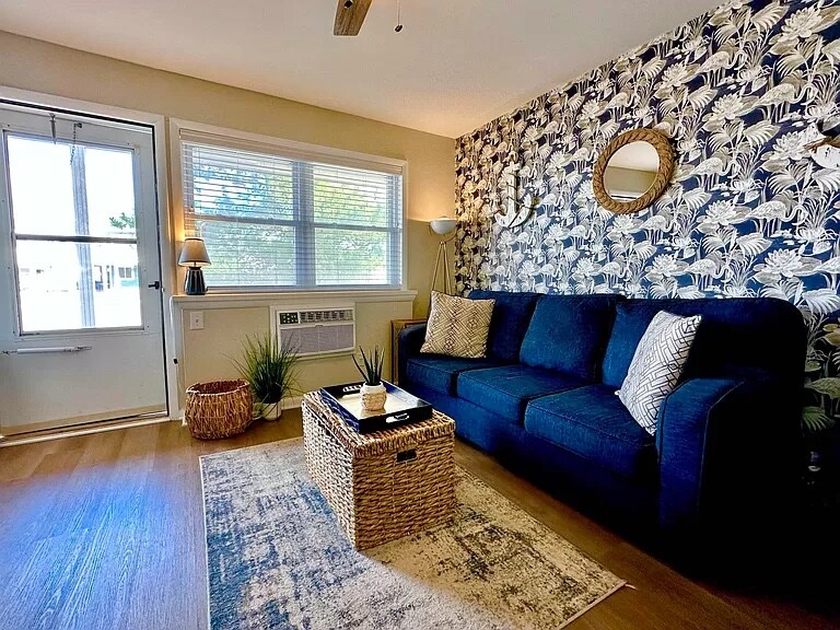 Dengan luas sekitar 189 kaki persegi, tempat yang nyaman namun bergaya ini sangat ideal untuk kehidupan yang ramping hanya satu blok dari pantai. Dapur kecil ini memiliki meja granit yang ramping, minifridge, microwave, kompor induksi, dan set makan counter - height. Kamar mandi menawarkan pancuran ubin khusus dengan nada biru - abu - abu yang menenangkan. Dilengkapi dengan tempat tidur queen, smart TV, dan biro, apartemen ini dirancang dengan cermat untuk kenyamanan Anda, lengkap dengan handuk pantai untuk kesenangan Anda.