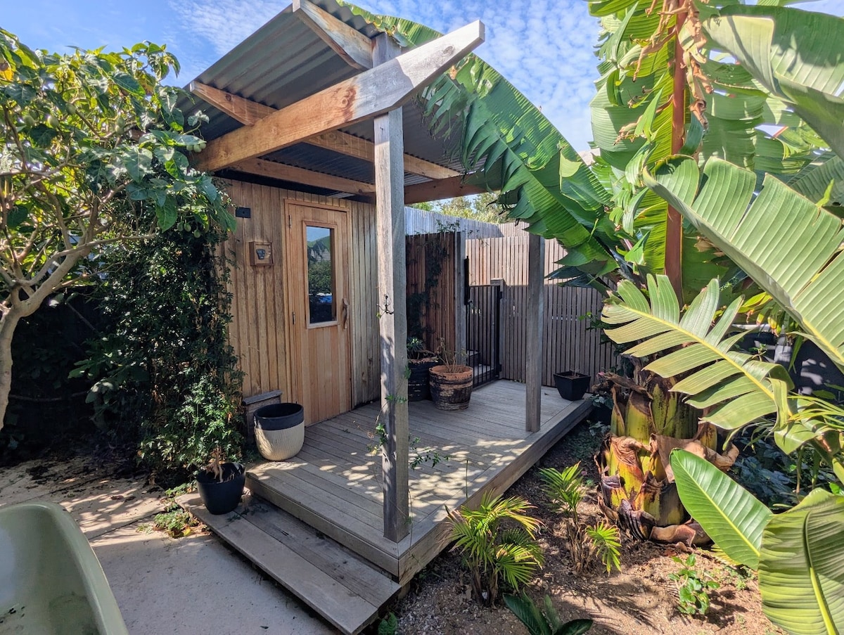 A peaceful rural outlook, sounds of frogs and birds, while lying in a luxurious bath in a stylish, spacious retreat, super comfy queen bed. 2.5km to Whites beach. Note: The studio is attached to our house, you may hear general life kitchen/tv noise, but you have a private entrance and secluded easterly deck. BBQ, & kitchenette with microwave, air fryer, rice cooker, kettle, toaster. Dog friendly. PLEASE - dog bath before arrival, bring a towel for muddy/sandy paws.