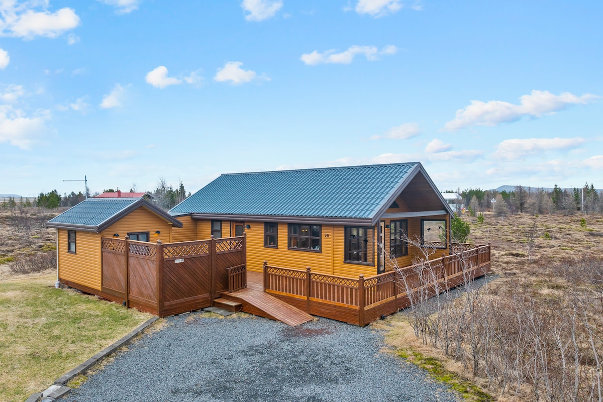 Kabin nyaman seluas 2400 kaki persegi di lingkungan yang indah yang terletak di lingkaran Emas - di area berpagar sekitar 50 menit berkendara dari Reykjavik. Kabinnya sangat bersih dan menawarkan semua fasilitas yang diperlukan untuk menikmati masa inap yang menyenangkan. 4 kamar tidur, 6 tempat tidur. Dapur yang dilengkapi dengan kulkas/freezer, kompor/oven, mesin Nespresso. TV dan meja biliar di ruang tamu lantai dua. Wifi gratis. Dua kamar mandi lengkap dengan pancuran. Dek sepenuhnya berpagar. Bak mandi air panas, tempat duduk luar dan BBQ. Pengisi Daya EV Gratis.