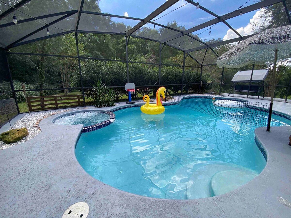 Welcome to your Spacious Getaway! Exterior Features: ★ LED Lights in Pool and on Pool Cage ★ Fenced-in yard & Fire-pit ★ Doorbell & Driveway Camera for safety Interior Features: ★ Ping Pong Table ★Large Shower in Master Bathroom ★ROKU on each TV Extras: ★ Heated Pool up to 95 Degrees - $40 per day (Pool Water is normally at 75 degrees without the Pool Heater) ⚠️ Pet-Friendly, but the pet must be added to the reservation ($75 Pet fee)⚠️ {Willing to Negotiate Monthly Prices}