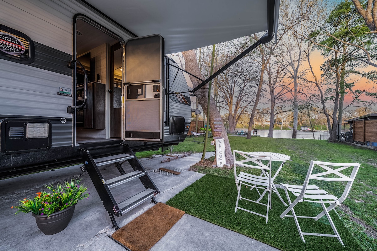 RV sepanjang 40 kaki ini terletak di lingkungan alami di puncak bukit di dekat Sungai Guadalupe yang menjadikannya tempat liburan glamping yang sempurna. Tempat ini memiliki nuansa luar ruangan yang berpetualang untuk melarikan diri dari semuanya tetapi dengan segala kenyamanan rumah. Semuanya berjarak 1 mil dari pusat kota Bersejarah Gruene dan 3 mil ke taman air Schlitterbahn dan pusat kota New Braunfels. Paket termasuk penggunaan tabung dan kayak. Izin KATA Comal County #L1494