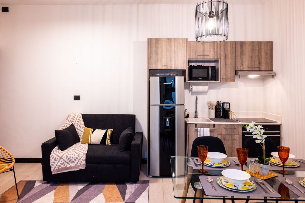 Apartemen 2 hingga 1 kamar tidur yang dimodifikasi untuk menawarkan suasana yang luar biasa dan pemandangan indah kota dan gunung berapi. Luasnya lebih dari 85 m2 dipadukan dengan peralatan dan dekorasi kelas satu. Kami memiliki kolam renang berpemanas di 31 C, gym lengkap, area sosial di lantai 25 sebagai Fire Pit; serta supermarket, salon kecantikan dan bangku di lobi. Terletak di zona hotel kota atau Zona Viva dalam jarak berjalan kaki dari rumah sakit, restoran, dan pusat perbelanjaan terbaik