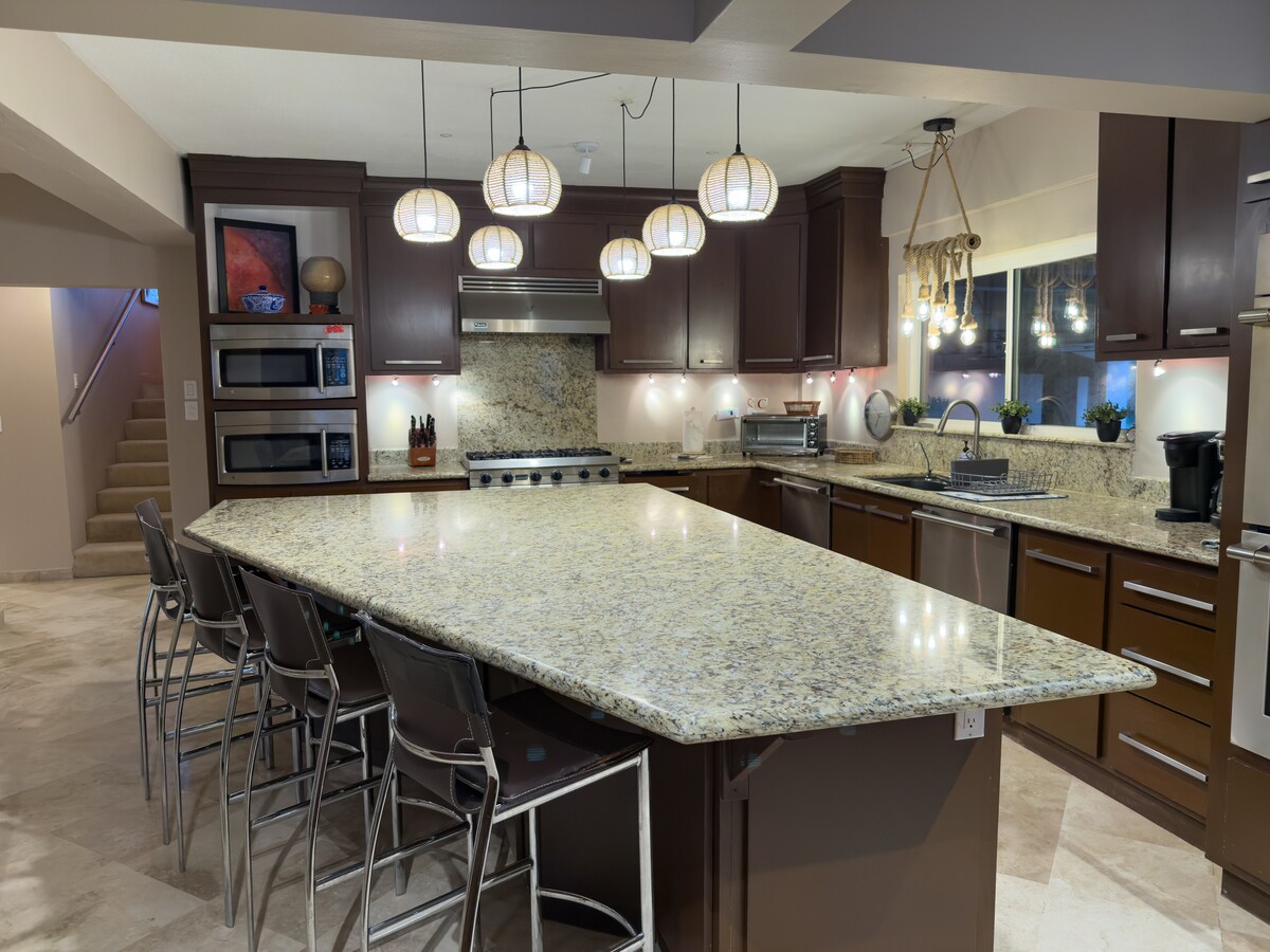 Pemandangan Laut Cortez, matahari terbit, marina, kota. Dekat toko, restoran, pub lokal. Berjalan kaki sebentar ke marina dan pantai San Carlos. 4 kamar tidur (satu kamar kecil dengan tempat tidur sofa), 3 kamar mandi lengkap, internet/WiFi Starlink yang cepat dan andal, pemurnian air/sistem pelembut, AC, panas, alarm asap/karbon monoksida, meja lipat, sistem audio Bluetooth, PlayStation 3, boks bayi Pack 'N Play, kursi tinggi. Dapur lengkap, mural/seni bergaya Meksiko, air mancur, balkon sampul, bersih dan nyaman.