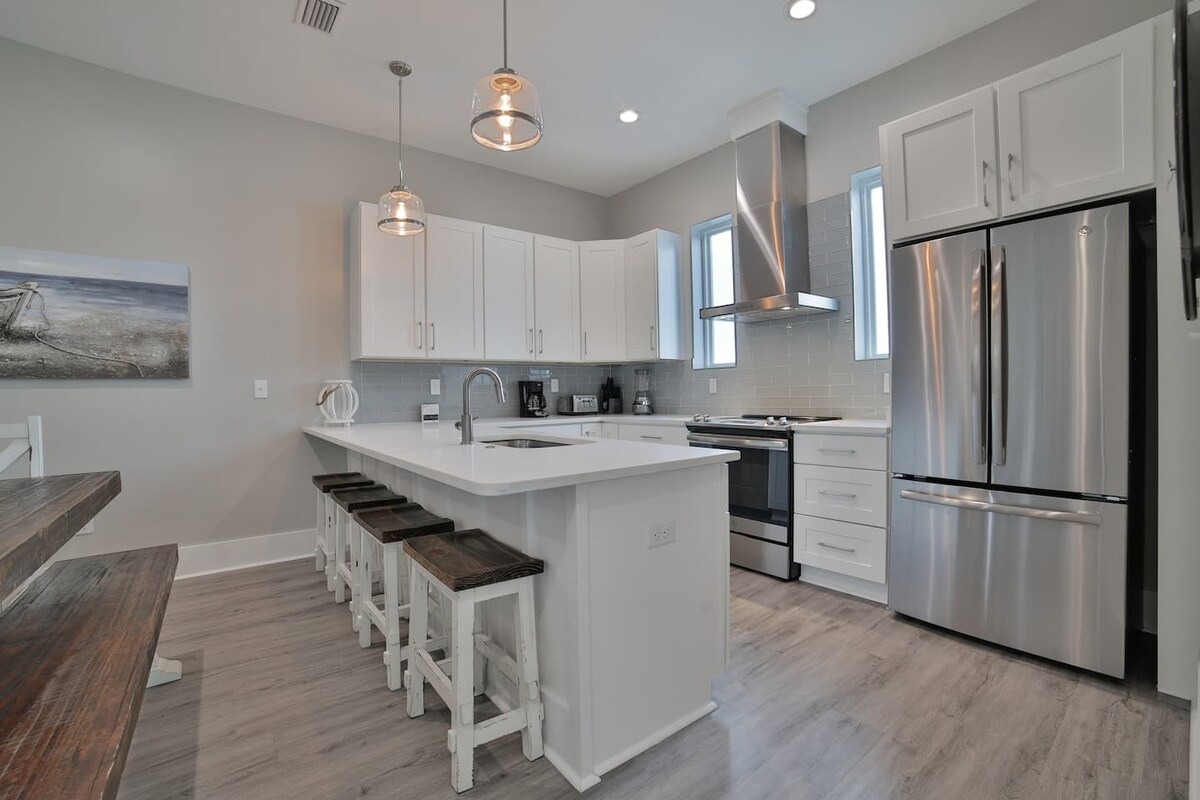 "Sandy Feet Retreat" is located in the heart of Gulf Shores. Walk to the white sands of the Gulf of America, "The Hangout", other restaurants, shops, entertainment and Gulf Shores Park. This newly constructed home is the largest Villa in this private Gulf Shores community. Enjoy the ocean breeze and sounds from four decks. Finishes are modern and airy providing a truly relaxing environment. Also has private outdoor grill and covered parking. A community pool is shared by the 7 Villas.