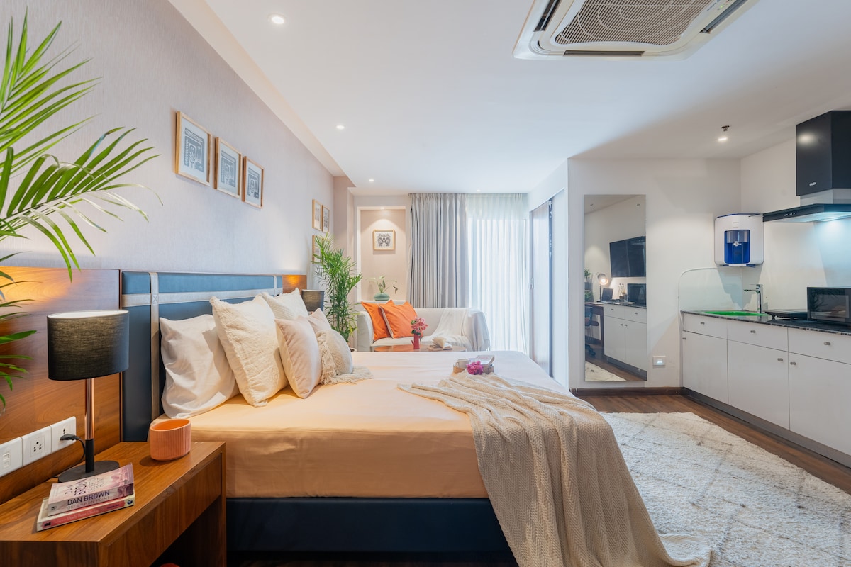 Indulge in the epitome of sophistication in this luxury studio apartment in the heart of South Delhi in Saket. Nestled in a prime location, Enjoy a tastefully furnished space, complete with luxurious decor and ample natural light. With a King Size Bed, Large screen 43" Smart TV, Fully functional pantry and a stylish washroom, every detail caters to a refined lifestyle. Immerse yourself in comfort & convenience. Welcome to a blend of luxury and urban living