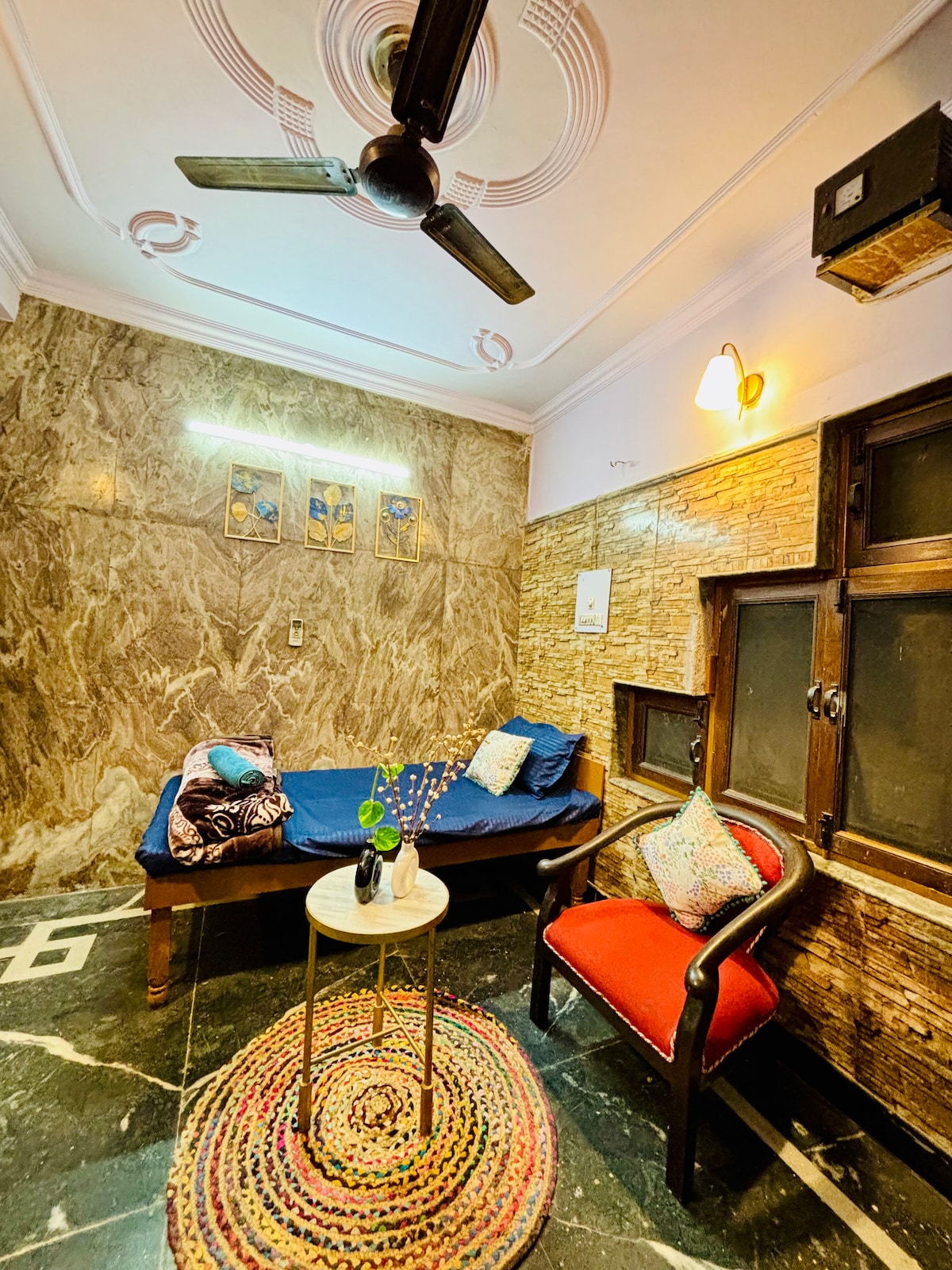 Vila katering mandiri 3 kamar ( Kamar Tidur + Ruang Tamu + Ruang Makan) dengan kamar mandi terpasang, dapur fungsional, teras sampul 2 sisi luar ruangan dan halaman belakang tertutup, total 1150 kaki persegi. Tempat tidur 5. Tiga AC split dan inverter dengan daya siaga satu jam untuk lampu dan kipas angin terpasang. Properti ini menghadap halaman dan kebun. Parkir aman tersedia untuk satu mobil. Ideal untuk menginap jangka panjang. 10 menit dengan mobil ke Rumah Sakit Max dan Pusat Distrik Saket.