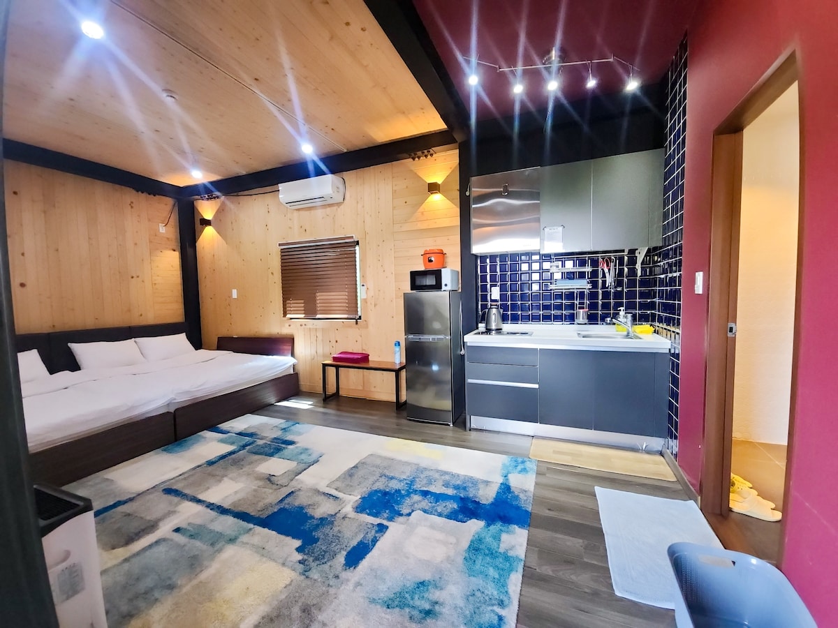 Terdiri dari 2 kamar 18 pyeong, kamar mandi, dapur, dan ruang tamu. Untuk barbekyu, Anda dapat menikmati barbekyu bersama oleh satu atau tiga tim di teras cantik 18 pyeong, di mana Anda dapat mendinginkan laut di depan Gunung Manisan di belakang. - Penggunaan berbayar Anda juga bisa barbekyu di dalam ruangan, yang merupakan ruang kafe selama musim dingin atau musim hujan, namun tamu dan tuan rumah lain yang menggunakan akomodasi membuat koordinasi waktu dan membatasi penggunaan barbekyu selama sekitar 2 jam (Namun, tidak ada batas waktu saat menggunakan barbekyu luar ruangan) 3 minimarket dalam radius 500 meter (GS -100 meter/CU -250 meter/Seven Eleven -5 ratus meter) Terdapat tempat parkir yang luas untuk 20 mobil termasuk mobil besar.
