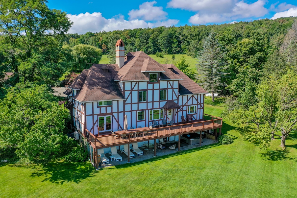 The Manor House Estate adalah properti pemandangan danau seluas 5.000 kaki persegi yang terletak tepat di Keuka Lake Wine Trail dalam jarak dekat dengan lebih dari 100 kilang anggur, kilang bir, dan penyulingan Finger Lakes dan beberapa mil dari beberapa tempat makan yang menakjubkan, toko ritel, museum, dan banyak lagi. Di mana pun Anda bisa menemukan tempat yang terjangkau di tempat yang besar dan menakjubkan ini! Perahu, kayak, dan sewa lainnya tersedia dalam jarak dua mil! Cocok untuk pernikahan dan acara lainnya! Tanyakan untuk detail selengkapnya. Maksimum 16 orang