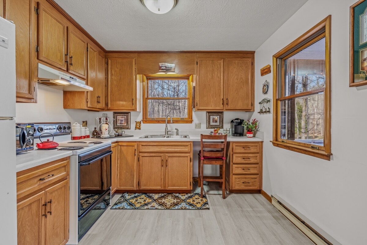 Tinggalkan tekanan kota! Bersantai di properti 3BR/2BA kami yang damai yang menampilkan peluang rekreasi seluas 50 hektar. Oasis hutan terpencil yang dilengkapi dengan ayunan, permainan luar ruangan, cincin api, jalur lintas alam dan bersepeda berkilo - kilometer. Rumah ini menyediakan loteng rekreasi, kamar yang bagus, dek tertutup dengan furnitur lounge dan ruang duduk tingkat bawah dengan perapian kedua. Tiga kamar tidur pribadi dengan dua tempat tidur tambahan di loteng tidur. Cocok untuk Penginapan Jangka Panjang.